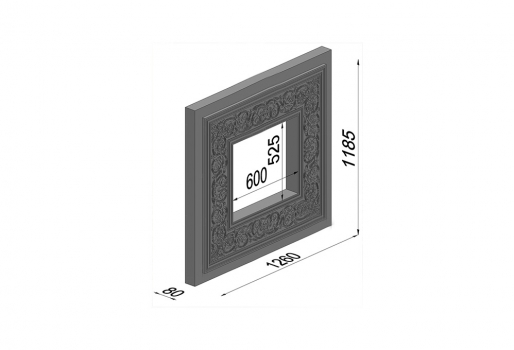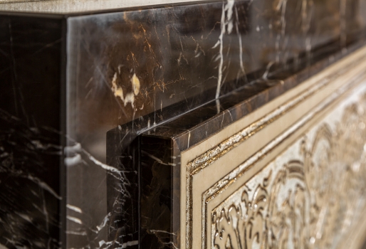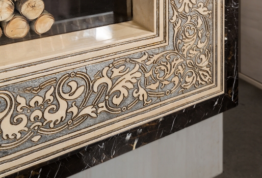 Фронтальный камин лаконичной прямоугольной формы с роскошным флористическим орнаментом, созданным на основе классических древнеегипетских мотивов. Здесь можно увидеть традиционное переплетение стилизованных цветков лотоса и папируса с волютами — изысканными и замысловатыми завитками, направленными в разные стороны.
