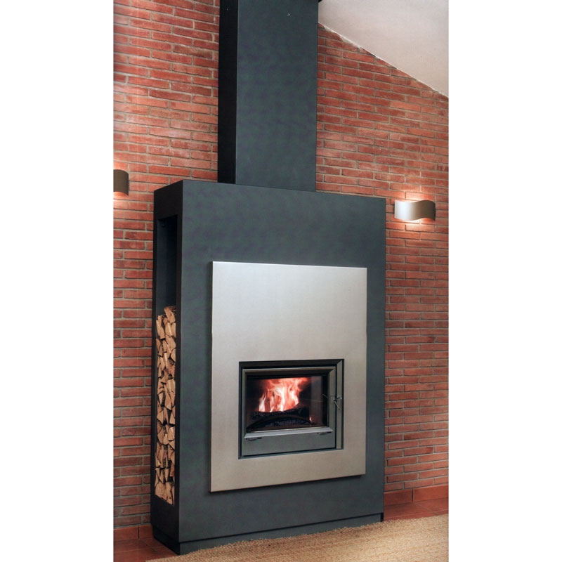 Пристенный металлический камин, вертикальные дровники с двух сторон. Фронтальная рамка из матовой нержавеющей стали. Инсерт Insert Panorama Clima - стандартная версия.